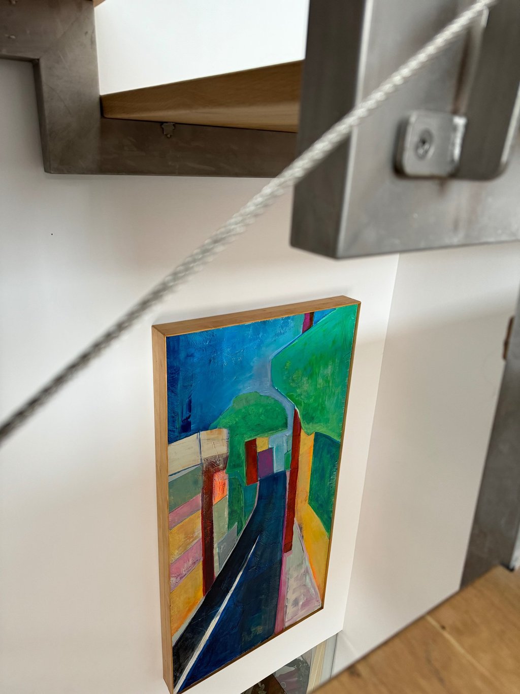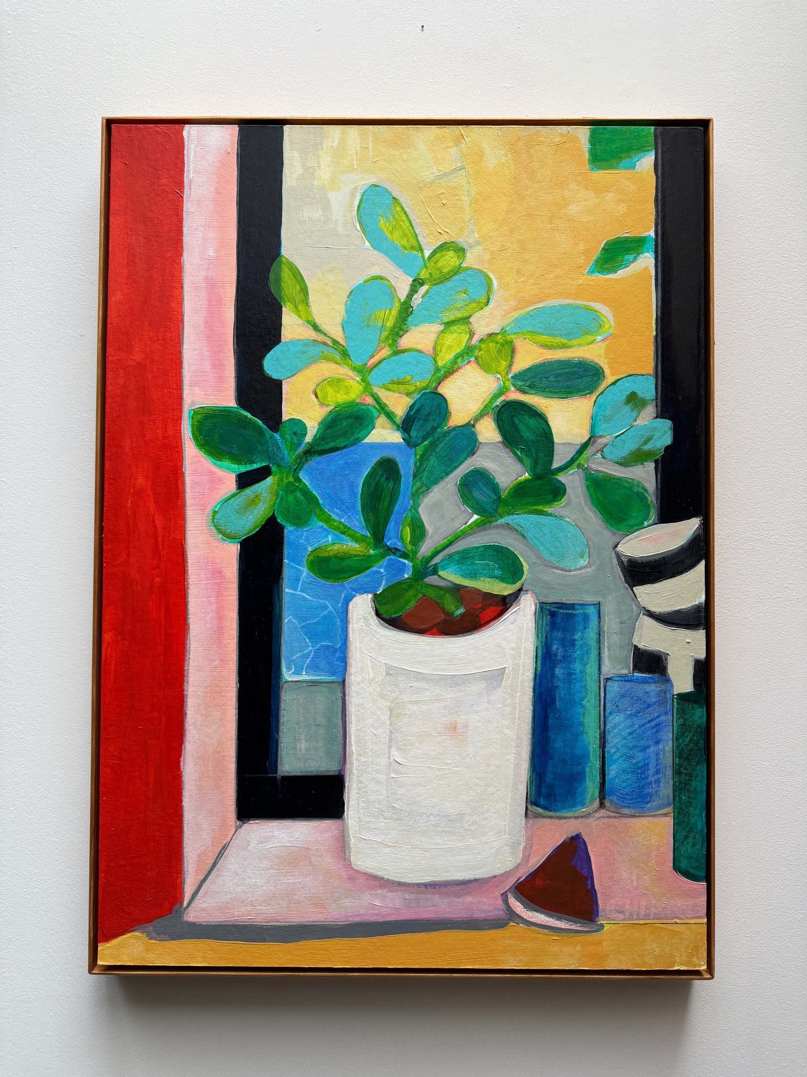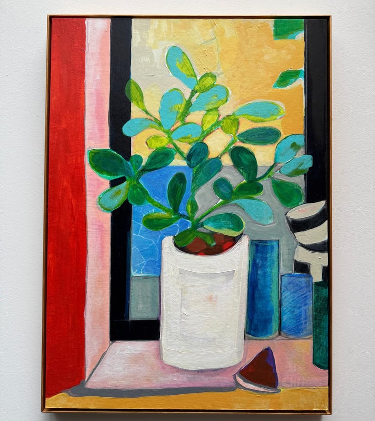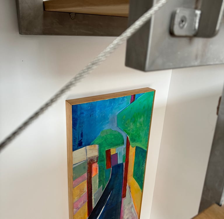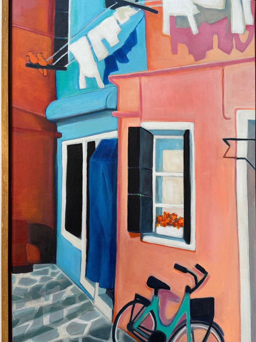I was fortunate to have been taught that art is important. My parents gave me permission to be an artist and to value what I could contribute in this way. Earning a BA in Fine Art and an MFA in Costume Design led me to a lengthy career as a corporate artist and a designer beginning in 1996. Along the way I have exhibited some of my work in galleries and through commisions. Most of my paintings this year are inspired by my family, our recent experiences and the everyday life in the community of Madrid. The beautiful wooden floating frames are custom made by my husband.