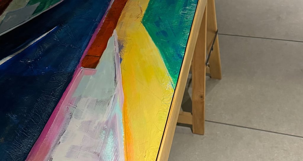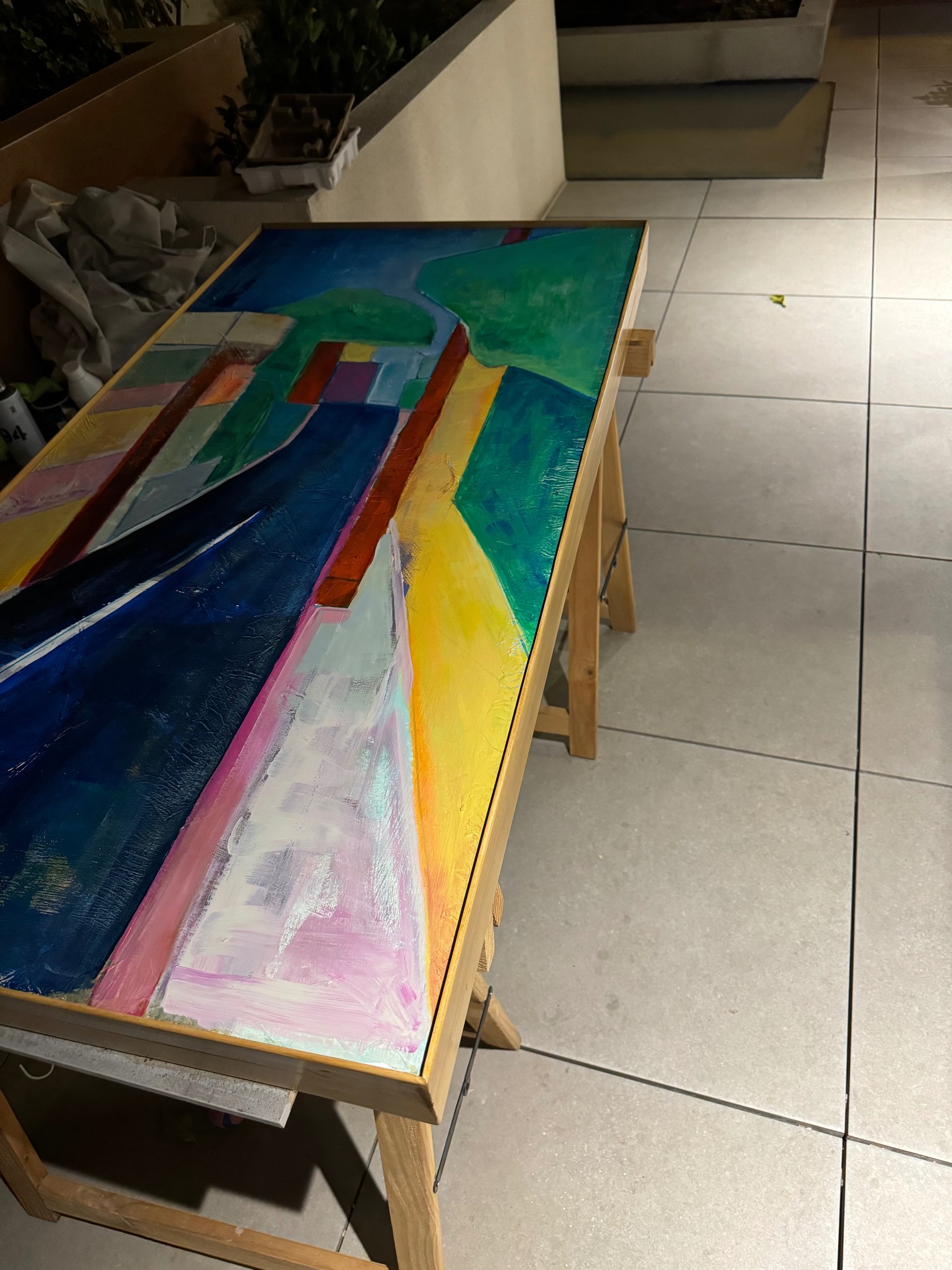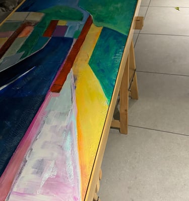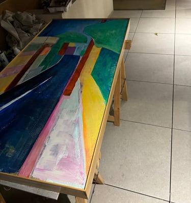 These colorful paintings reflect some of the city of Madrid as I am experiencing it. The support for my artistic resurgence is the work of my dear husband Chris. Providing beautiful custom wood frames made by hand. They are beautiful!