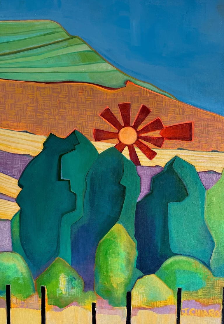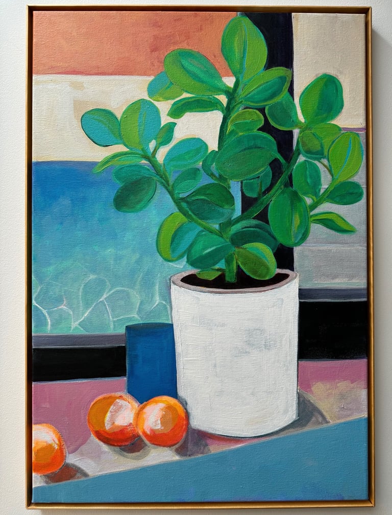 I was fortunate to have been taught that art is important. My parents gave me permission to be an artist and to value what I could contribute in this way. Earning a BA in Fine Art and an MFA in Costume Design led me to a lengthy career as a corporate artist and a designer beginning in 1996. Along the way I have exhibited some of my work in galleries and through commisions. Most of my paintings this year are inspired by my family, our recent experiences and the everyday life in the community of Madrid. The beautiful wooden floating frames are custom made by my husband.